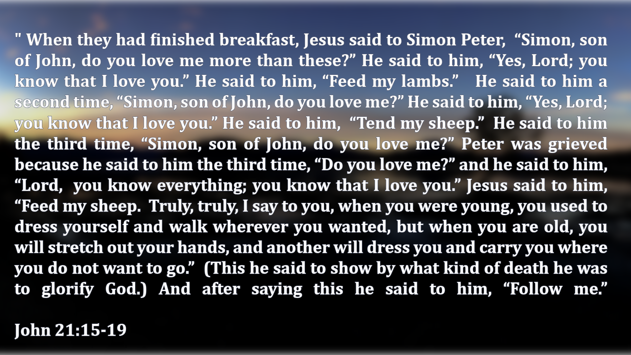 John 21:15-19 When they had finished breakfast, Jesus said to Simon Peter, “Simon, son of John, do you love me more than these?” He said to him, “Yes, Lord; you know that I love you.” He said to him, “Feed my lambs.”