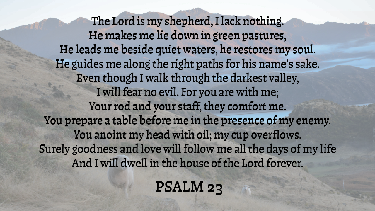 Psalm 23 is my go-to prayer/ meditation for any season, but particularly when I need extra comfort. This profound literary declaration of God’s love and goodness is packed with promises. Despite the power within, it feels as if it were a lullaby - presented as a pastoral scene, with us as simple sheep and the Lord as our secure shepherd, whom we trust so intrinsically that we have not a care in the world. It further feels like a lullaby to me because I memorized it as a child, and have been carrying it within me ever since, like an inner security blanket.